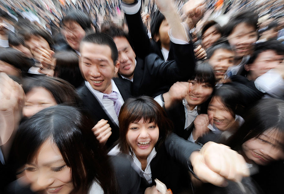 2月10日,日本東京職業(yè)學(xué)校的學(xué)生在求職動(dòng)員會(huì)上伸出拳頭展現(xiàn)信心。日本的失業(yè)率達(dá)5%,2011屆畢業(yè)生將面臨嚴(yán)峻就業(yè)形式。圖片來源:中國新聞網(wǎng)