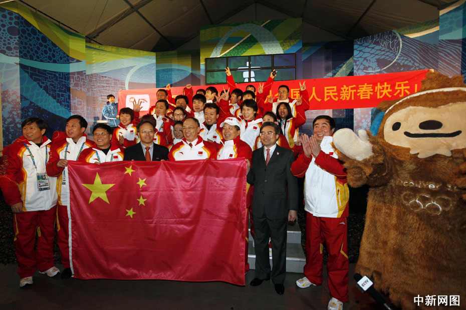 當(dāng)?shù)貢r(shí)間2月10日,中國(guó)代表團(tuán)在溫哥華冬奧會(huì)奧運(yùn)村舉行升旗儀式。升旗儀式結(jié)束后,中國(guó)代表團(tuán)團(tuán)長(zhǎng)劉鵬帶領(lǐng)代表團(tuán)成員展開橫幅高聲向全體國(guó)人送上新春祝福。中新社記者 盛佳鵬 攝