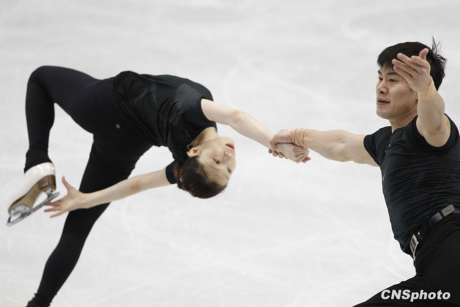 當?shù)貢r間2月13日,中國花樣滑冰隊龐清/佟健、張丹/張昊在溫哥華太平洋體育館,利用最后的休息時間重復練習積極備戰(zhàn)即將到來的比賽。中新社記者 盛佳鵬 攝