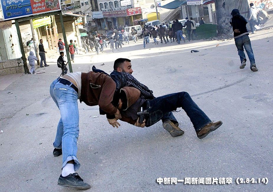 周二(9日)在耶路撒冷東部的難民營(yíng),一個(gè)巴勒斯坦暴亂分子(左)與一名以色列便衣警察扭打在一起。