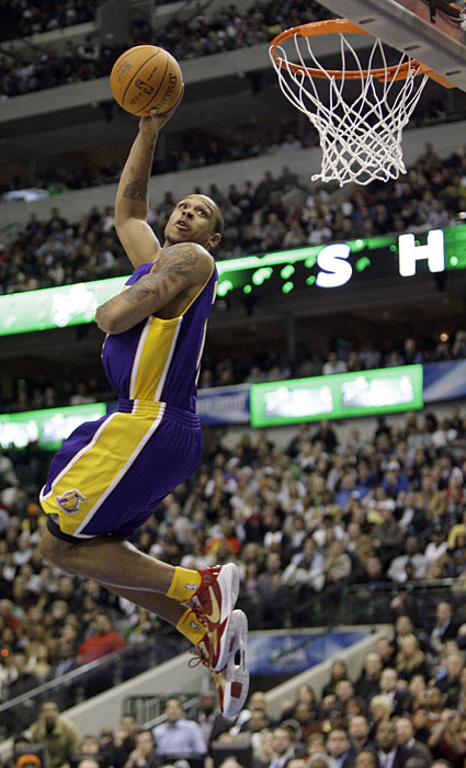圖為洛杉磯湖人隊的香農(nóng)布朗進(jìn)行扣籃表演。