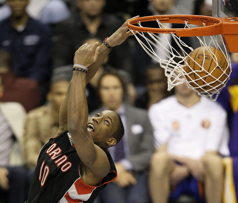圖為多倫多猛龍隊(duì)的德羅贊進(jìn)行扣籃表演。