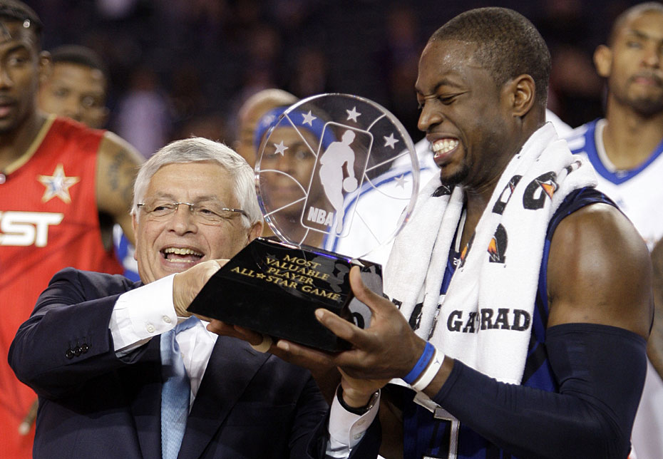 圖為東部明星聯(lián)隊(duì)球員韋德(右)接受MVP最有價(jià)值球員獎(jiǎng)杯。