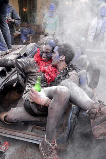 2月15日,希臘港口加拉西迪,狂歡者在街頭參加“面粉大戰(zhàn)”!懊娣鄞髴(zhàn)”是當(dāng)?shù)貞c?駳g季結(jié)束的一項(xiàng)傳統(tǒng)活動(dòng),隨后將是為期40天的齋戒月直至復(fù)活節(jié)。圖片來(lái)源:中國(guó)新聞網(wǎng)