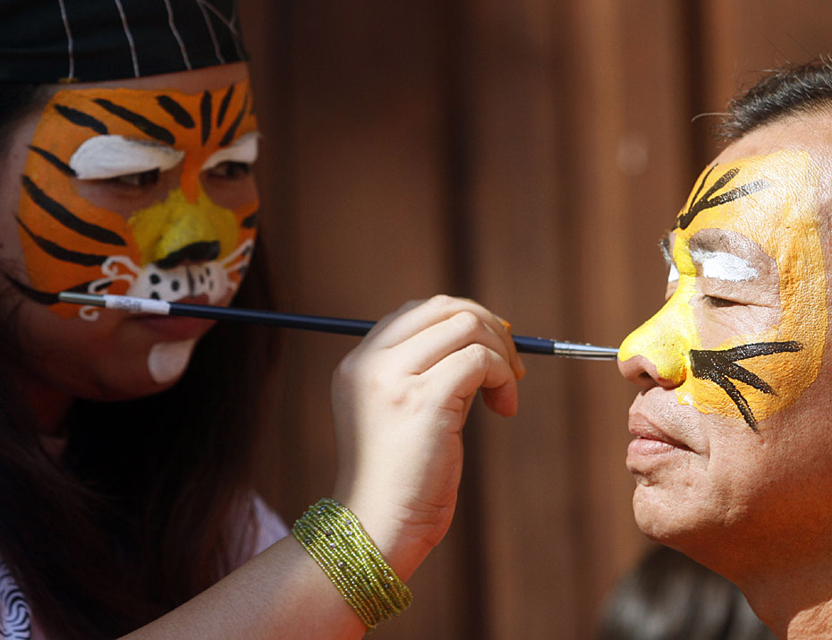 2月20日,馬來(lái)西亞民眾圍聚在首都吉隆坡附近的佛光山東禪寺,紛紛將自己繪成老虎的樣子,呼吁大家保護(hù)野生虎。圖片來(lái)源:中國(guó)新聞網(wǎng)