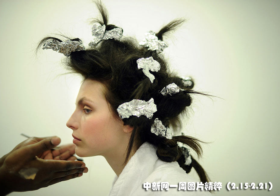 2月17日(周三),一個(gè)模特在2010年紐約秋季時(shí)裝周后臺化妝。