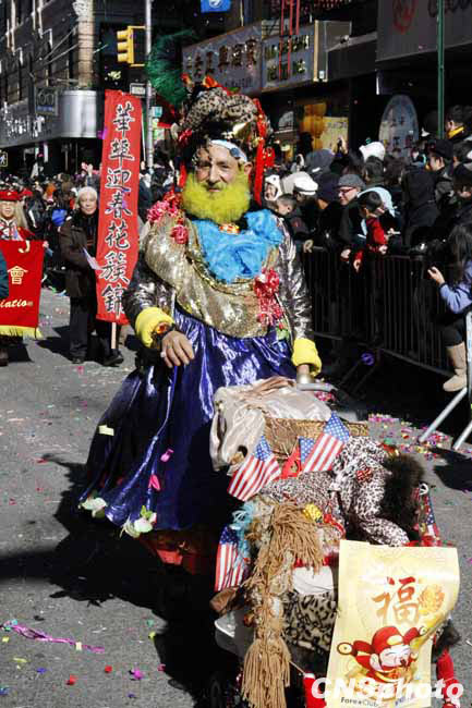 虎年紐約華埠慶祝農(nóng)歷新年“重頭戲”花車大游行21日登場,吸引超過10萬人圍觀共同狂歡,成為歷年來參加人數(shù)最多的一次花車游行。12輛盛裝花車以及數(shù)千人的表演團隊沿著華埠最熱鬧的數(shù)十條街道一邊行進一邊表演,滿天彩帶飄揚,場面熱鬧非常。圖為游行隊伍中奇裝異服的美國人。