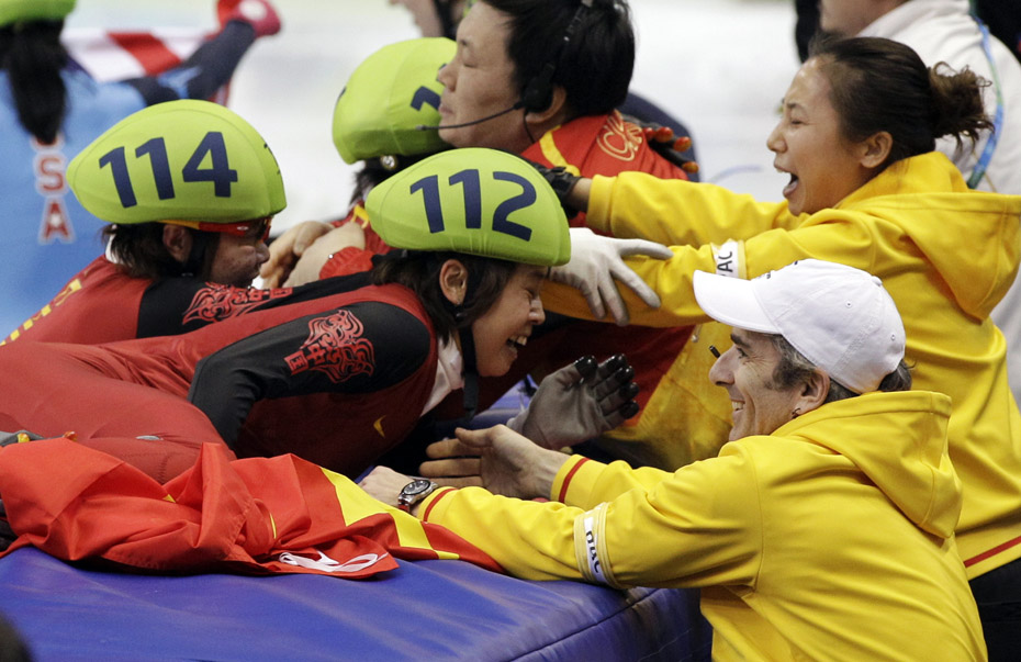 當(dāng)?shù)貢r(shí)間2月24日,溫哥華冬奧會(huì)女子短道速滑3000米接力A組決賽中,中國隊(duì)王濛、周洋、孫琳琳、張會(huì)四朵金花聯(lián)袂出擊,最終將金牌歸入中國隊(duì)囊中。圖片來源:中國新聞網(wǎng)
