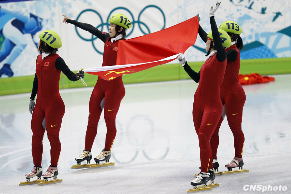 當?shù)貢r間2月24日,溫哥華冬奧會女子短道速滑3000米接力A組決賽中,中國隊王濛、周洋、孫琳琳、張會四朵金花聯(lián)袂出擊,最終將金牌歸入中國隊囊中。圖片來源:中國新聞網(wǎng)