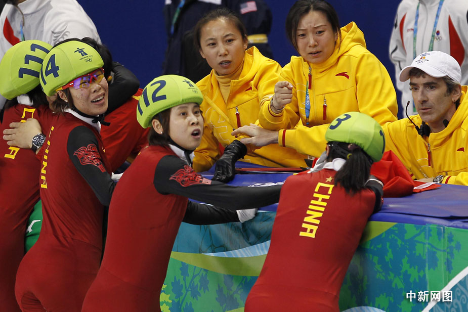 在裁判宣布韓國隊(duì)犯規(guī)后,一直等候著最終結(jié)果的中國姑娘忘情地?fù)湎蚪叹毾D片清楚地顯示,興奮的王濛撲到教練李琰前面寬寬的防護(hù)墊上,她的右腿無意間高高抬起,冰刀刮到了跟在她身后的張會(huì)的下巴。王濛意識(shí)到自己闖了禍,馬上關(guān)切地回頭察看張會(huì)的傷情。四位姑娘舉著國旗慶祝勝利時(shí),張會(huì)用手捂著她的下巴,漸漸地鮮血浸濕了她的手套。