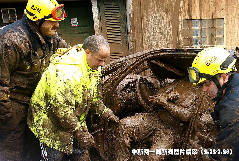 22日(周一),在葡萄牙馬德拉島豐沙爾市,救援人員在移出車廂內(nèi)的遇難者遺體。當(dāng)?shù)卣硎荆珊闉?zāi)引發(fā)的泥石流導(dǎo)致42人死亡,32人失蹤。