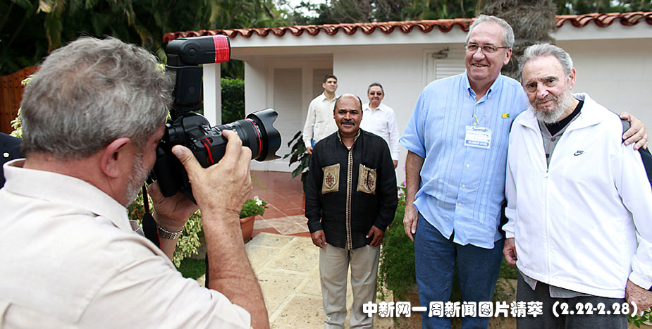 24日(周三),在古巴哈瓦那,巴西總統(tǒng)盧拉手持相機為巴西交通部部長和前古巴領(lǐng)袖卡斯特羅(Fidel Castro)拍照。