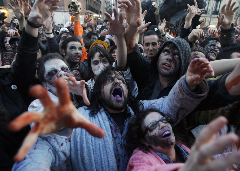 當(dāng)?shù)貢r(shí)間2月27日,在西班牙馬德里,眾多愛好者裝扮成“僵尸”的模樣,在街頭舉行巡游活動。