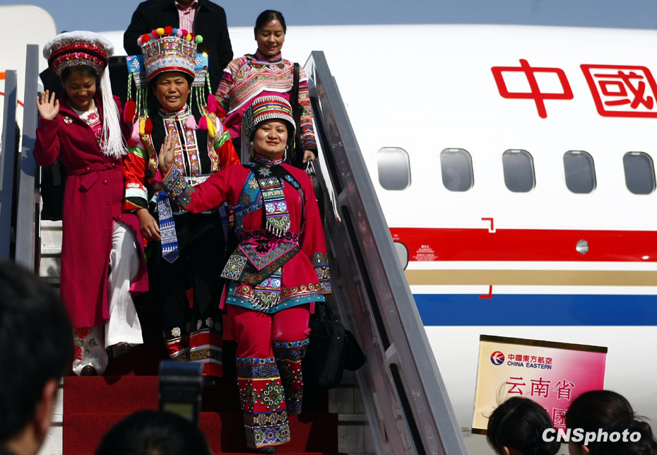 3月2日,參加全國(guó)兩會(huì)的代表、委員陸續(xù)抵達(dá)北京。圖為云南代表團(tuán)的少數(shù)民族代表盛裝抵京。中新社發(fā) 杜洋 攝