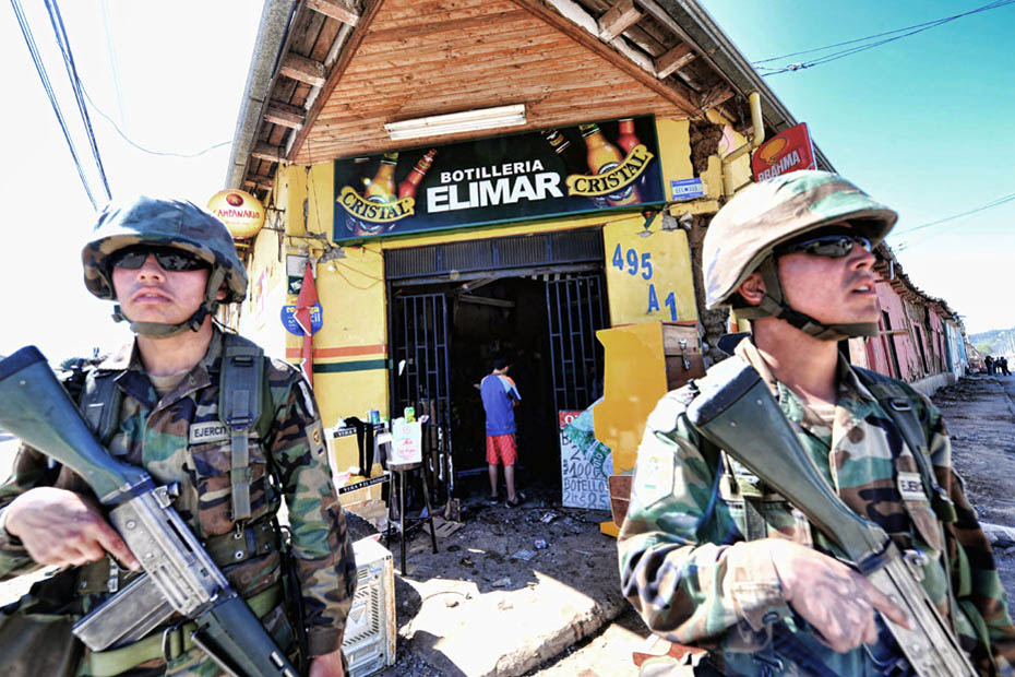 3月2日,智利軍警在街頭維持秩序。智利總統(tǒng)巴切萊特當(dāng)日說,政府派往災(zāi)區(qū)維持治安的軍人數(shù)量已達(dá)14000人,地震重災(zāi)區(qū)的搶劫現(xiàn)象已得到控制。圖片來源:中國新聞網(wǎng)