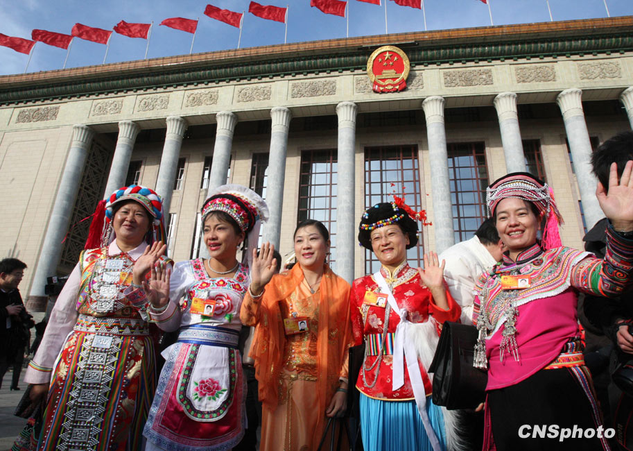 3月5日上午9時(shí),十一屆全國(guó)人大三次會(huì)議在北京隆重開幕。國(guó)務(wù)院總理溫家寶作政府工作報(bào)告。圖為少數(shù)民族女代表盛裝出席人大開幕會(huì)。 中新社發(fā) 湯彥俊 攝