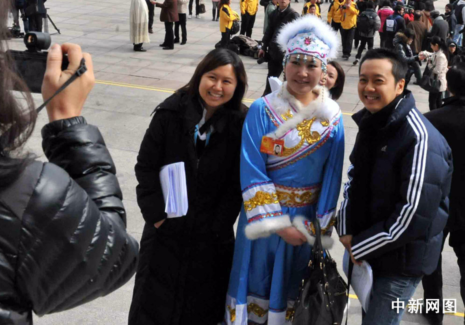 十一屆全國人大三次會(huì)議3月5日在北京開幕,各民族人大女代表的服飾靚麗多彩,在天安門廣場(chǎng)前大展英姿。 中新社記者 賈國榮 攝