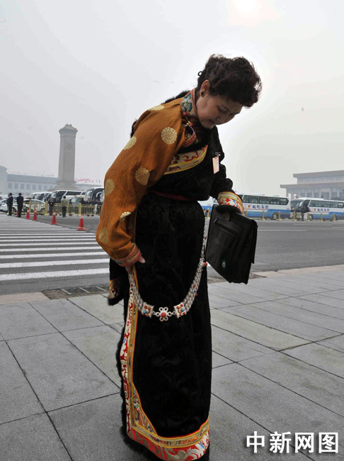 藏族女代表整理衣裝。中新社記者 賈國榮 攝