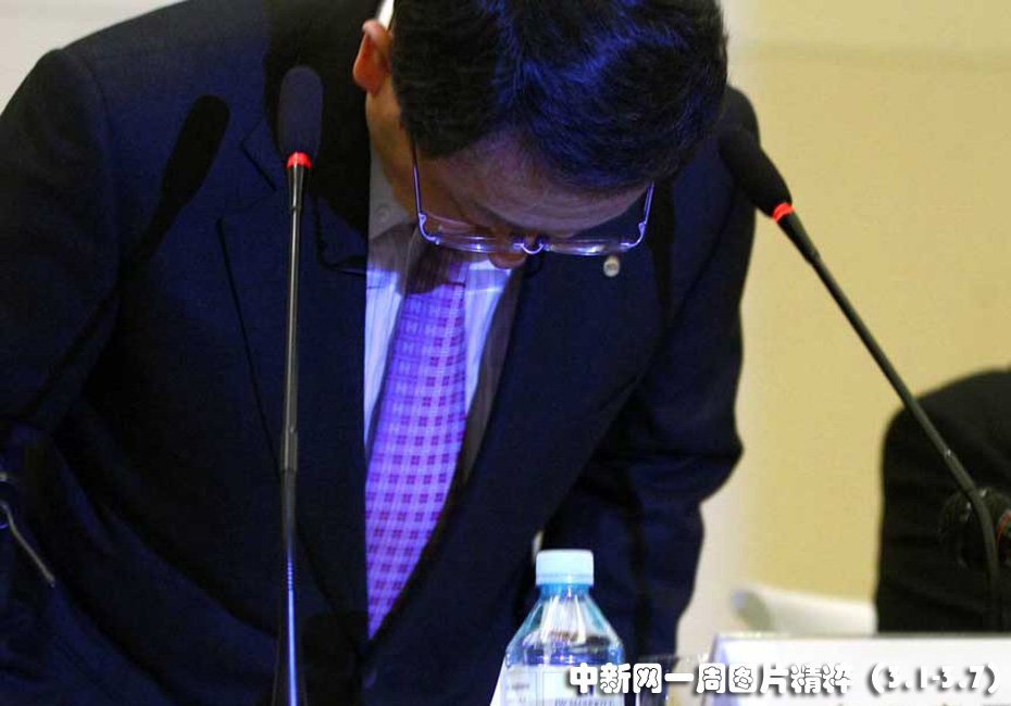 3月1日,豐田汽車總裁豐田章男今日在北京舉行記者會,介紹了豐田汽車大規(guī)模召回的原因及處理措施,并向中國消費者鞠躬道歉。圖片來源:中國新聞網(wǎng)