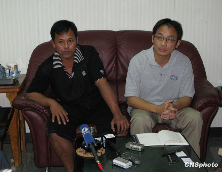 圖為3月6日“穩(wěn)發(fā)161號”船長顏勝男(左)、穩(wěn)發(fā)漁業(yè)公司經(jīng)理劉銘復(右)在高雄接受大陸記者采訪,他們感謝大陸船東協(xié)會提供及時幫助、海軍提供柴油、伙食和護航。 中新社發(fā) 耿軍 攝
