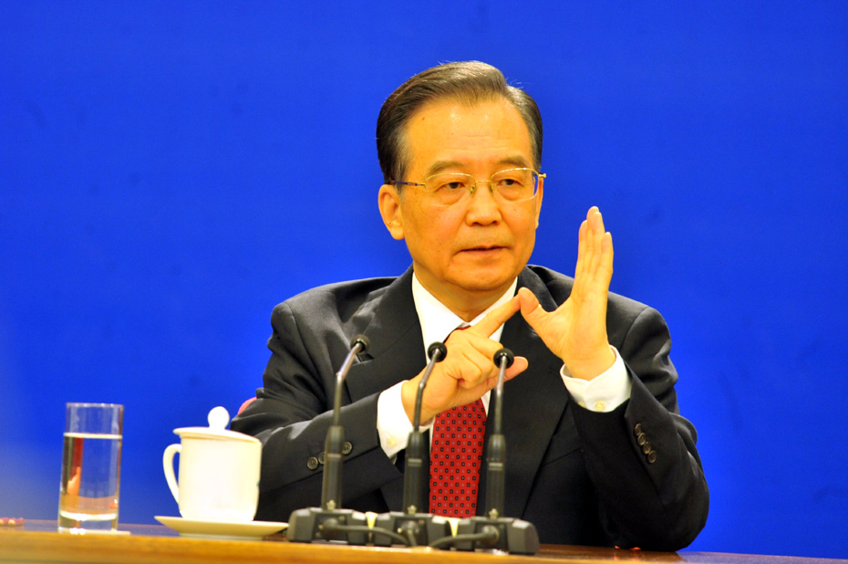 3月14日上午,國務院總理溫家寶在人民大會堂三樓金色大廳與采訪十一屆全國人大三次會議的中外記者見面并回答記者提出的問題。中新社記者 賈國榮 攝 圖片來源:中國新聞網(wǎng)
