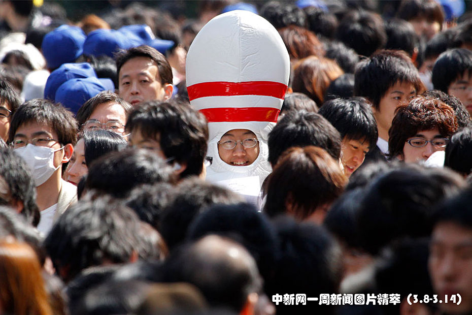 周三,日本東京大學(xué)校園里,一名學(xué)生裝扮成保齡球瓶的樣子。當(dāng)天,這所日本最富盛名的大學(xué)放榜,眾多考生前往查榜。圖片來源:中國(guó)新聞網(wǎng)