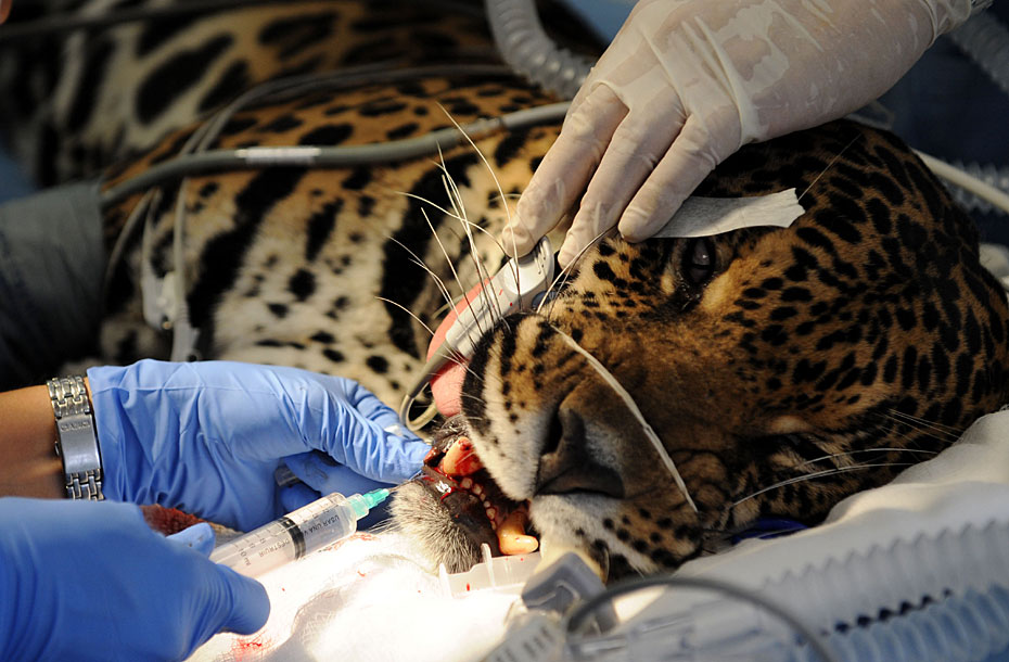 3月13日,在哥倫比亞麥德林附近的一個獸醫(yī)診所,一只雌性美洲虎在接受牙齒手術。圖片來源:中國新聞網(wǎng)