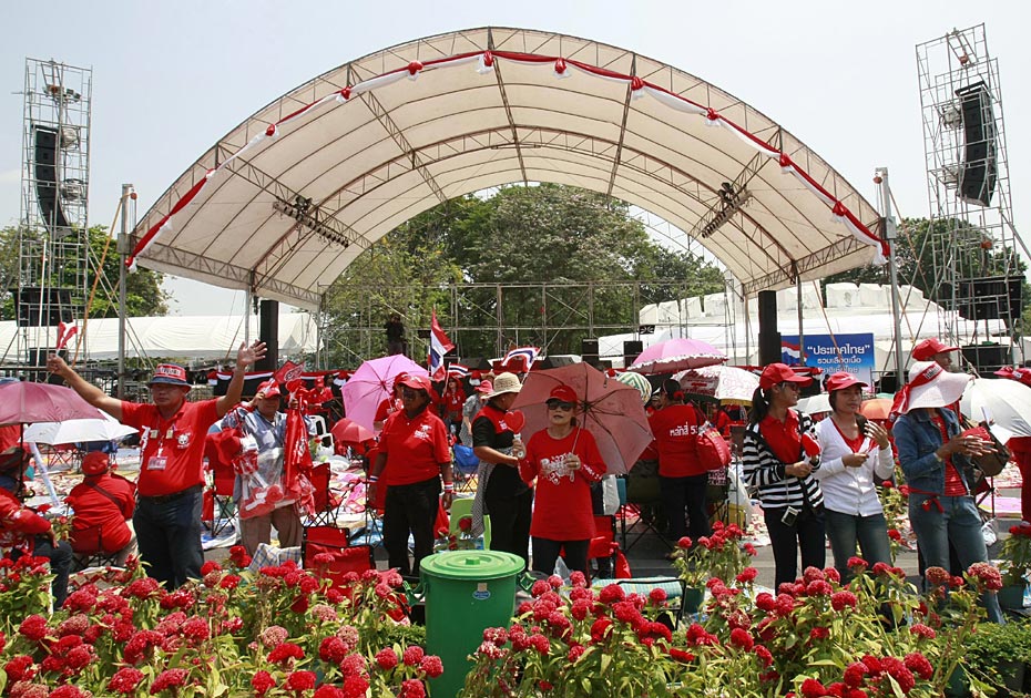 3月13日起,泰國“紅衫軍”陸續(xù)從泰國北部、東北部等外府進入曼谷市,在集會主會場搭設演講舞臺和帳篷,拉開大規(guī)模示威序幕。圖片來源:中國新聞網(wǎng)
