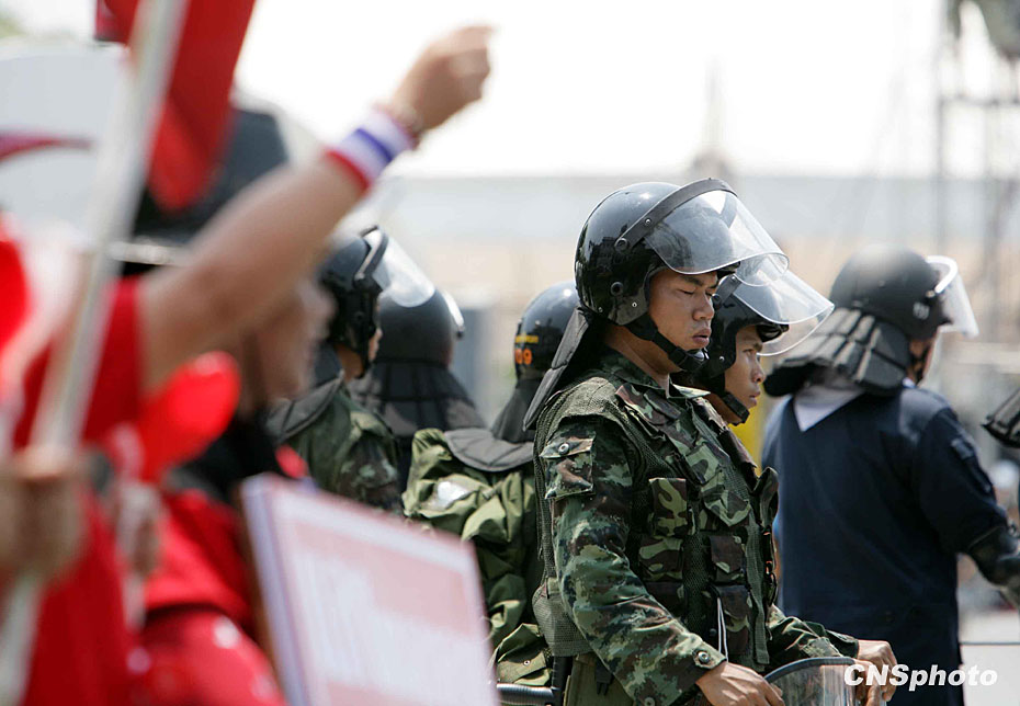 3月13日起,泰國“紅衫軍”陸續(xù)從泰國北部、東北部等外府進入曼谷市,在集會主會場搭設演講舞臺和帳篷,拉開大規(guī)模示威序幕。圖片來源:中國新聞網(wǎng)