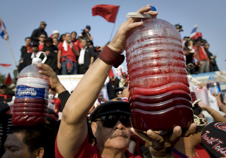 泰國反政府組織“紅衫軍”成員將血液潑灑在曼谷總理府門前,以此向政府施壓要求解散國會下議院。圖片來源:中國新聞網(wǎng)