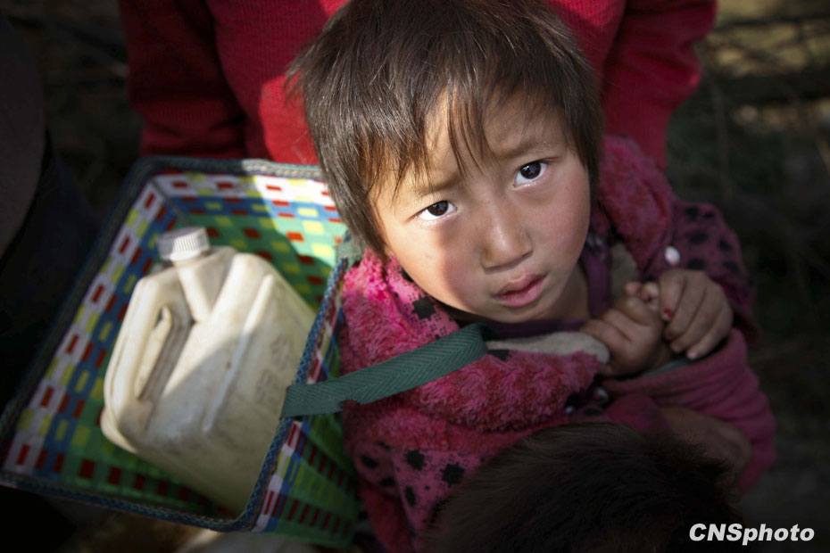 3月12日,在云南省富源縣小羊場村口等待取水的兒童。中新社發(fā) 劉冉陽 攝