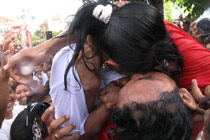 如果不說話,她能滿足所有男人對女人最原始的憧憬——巴掌大的小瓜子臉上,濃密的齊劉海和流利的黑眼線共同強(qiáng)調(diào)出一對碩大的眼睛,眼珠在小扇子一樣撲閃撲閃的睫毛下面望著你,無辜得像一個剛從造物主手中問世的SD娃娃。這不是全部,還有更震撼的信息等著再給你的心一記重擂——在精致妝容下根本看不出實(shí)際年齡的臉,加上65E的胸圍,再配上一尺六寸的小腰,哪怕同是女人,光想一想這不切實(shí)際的場景也足以胸悶到內(nèi)傷。
