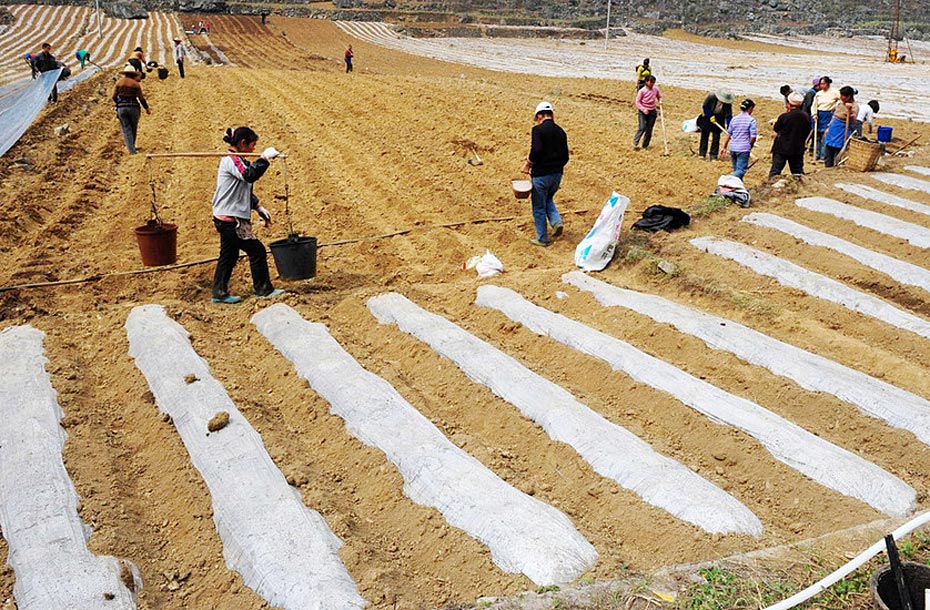 3月14日,貴州省長順縣宂雷村村民正在加緊補種早熟玉米,并利用覆膜技術(shù)保持土壤水分。圖片來源:新華網(wǎng) 劉續(xù) 攝