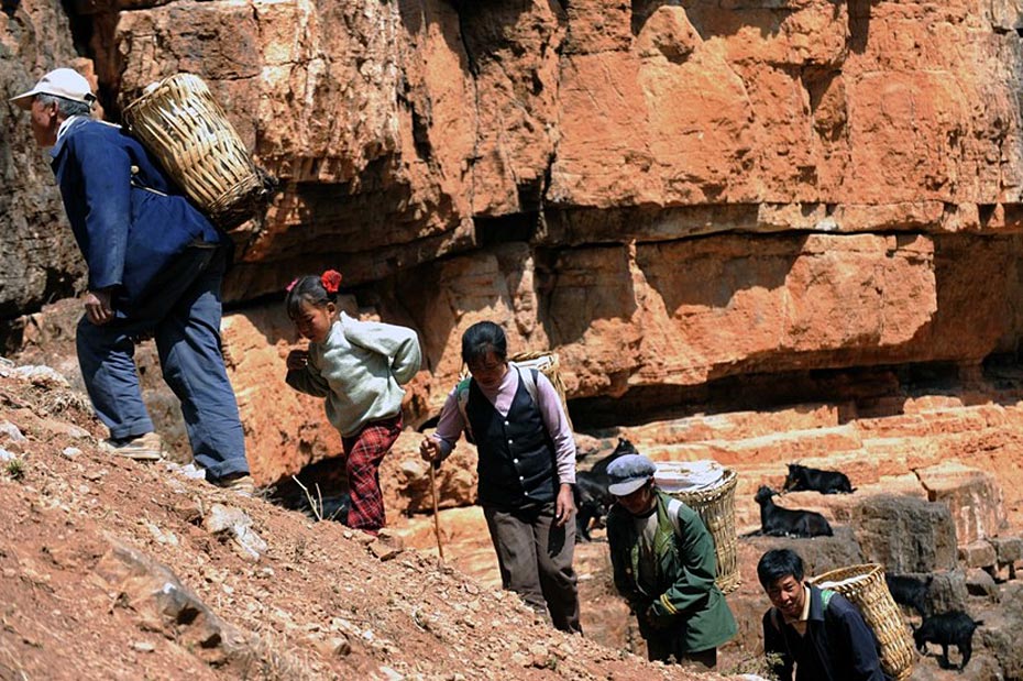村民背著水走在陡峭的山崖上(3月7日攝)。村民需要背著幾十公斤重的水桶,從海拔1000多米的江邊,小心翼翼地往海拔1800多米的村中跋涉。圖片來(lái)源:新華網(wǎng) 秦晴 攝