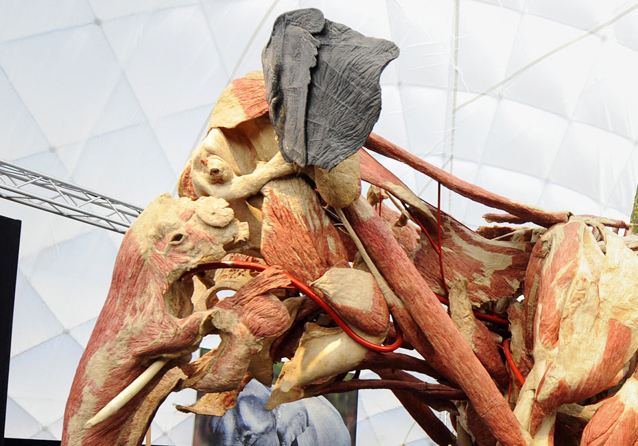 德國著名解剖學(xué)家鞏特爾·馮·哈根斯博士被稱為“死亡先生”,目前展出的是有史以來的最大的動物尸體。體型巨大的“桑芭”尸體高3.5米,重3.2噸。據(jù)悉“桑芭”將于2010年4月歸還諾因基興動物園。圖片來源:中國新聞網(wǎng)