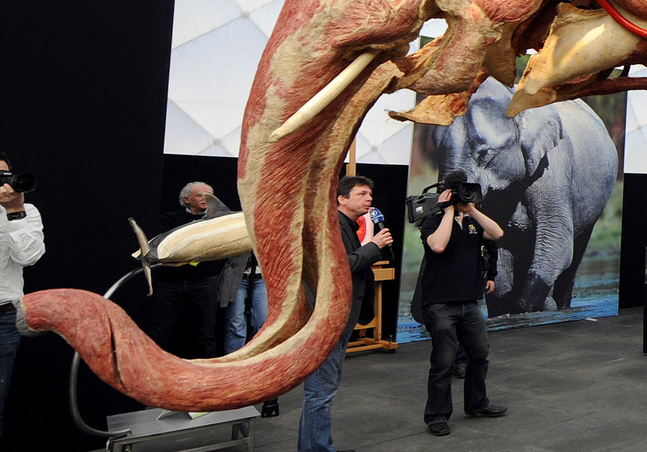3月18日,德國解剖學(xué)家鞏特爾·馮·哈根斯目前正在展出有史以來的最大的尸體,一只生前在德國薩爾州諾因基興動(dòng)物園很受歡迎的名為“桑芭”的母大象。 圖片來源:中國新聞網(wǎng)