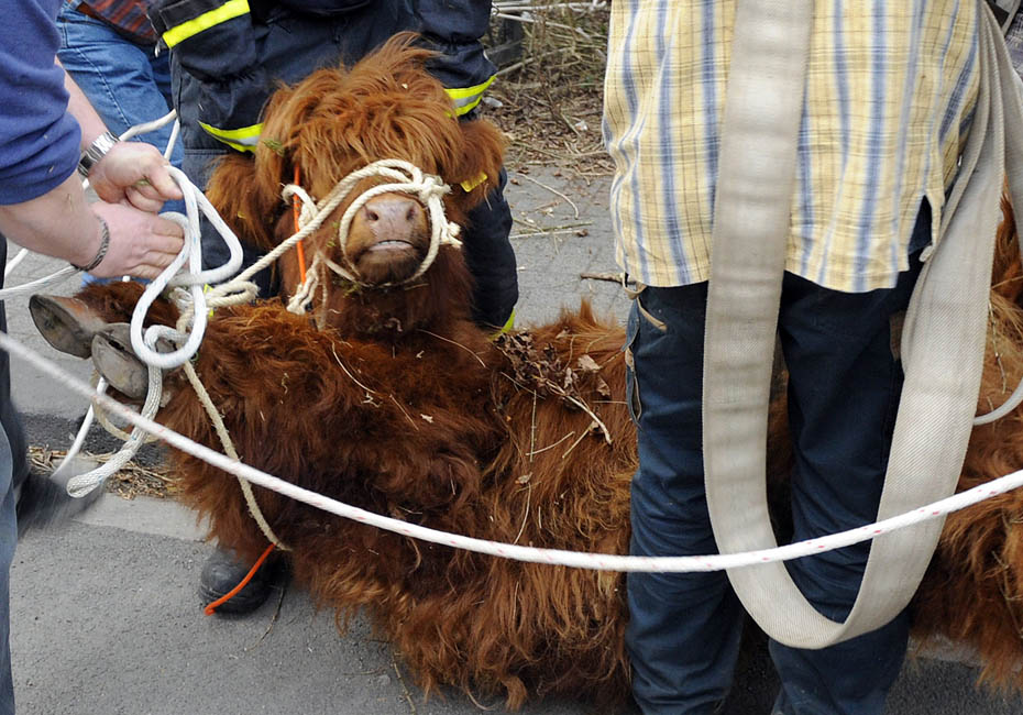 3月18日,德國一頭蘇格蘭高地牛來到一居民院內(nèi)懶洋洋的曬太陽,最后經(jīng)過獸醫(yī)的麻醉和消防員協(xié)力才將這頭蠻力十足的家伙“制服”。圖片來源:中國新聞網(wǎng)