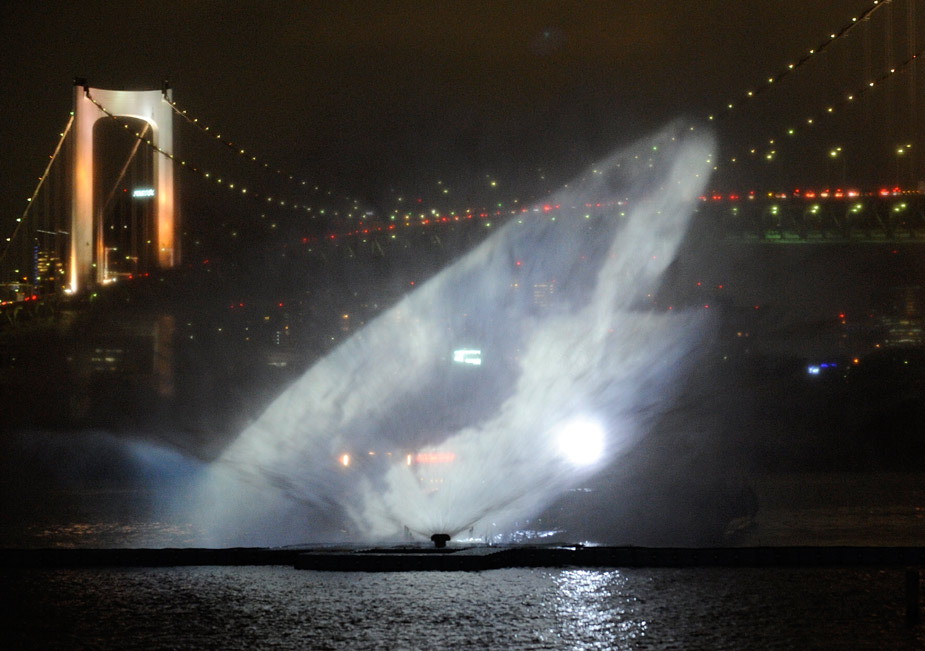 3月19日晚,在日本東京灣上演了一場(chǎng)美輪美奐的“海上幻燈”。東京灣的噴泉噴射出長(zhǎng)60米、高23米的各種海洋生物的畫(huà)面,令人驚嘆。