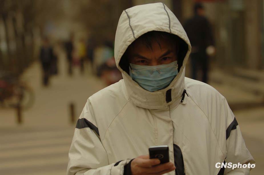 3月20日,春季首場(chǎng)重度浮塵天遮蓋了整個(gè)北京城。圖為北京市民在街頭“全副武裝”。中新社發(fā) 鄒憲 攝