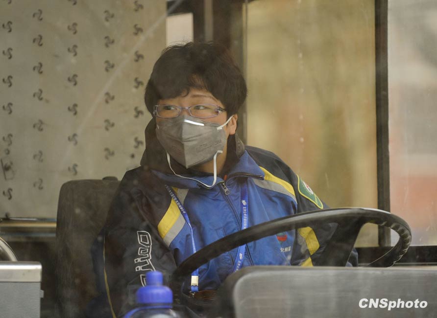 3月20日,春季首場(chǎng)重度浮塵天遮蓋了整個(gè)北京城。圖為一位公交車司機(jī)戴上防塵口罩。中新社發(fā) 廖攀 攝