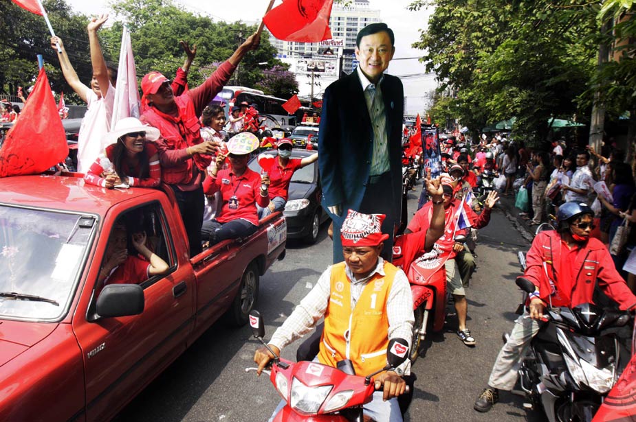 泰國(guó)紅衫軍20日號(hào)召數(shù)千輛汽車(chē)上街,在曼谷大游行,路線總長(zhǎng)約45公里,橫跨曼谷多條主要街道,勢(shì)要癱瘓曼谷。圖片來(lái)源:中國(guó)新聞網(wǎng)