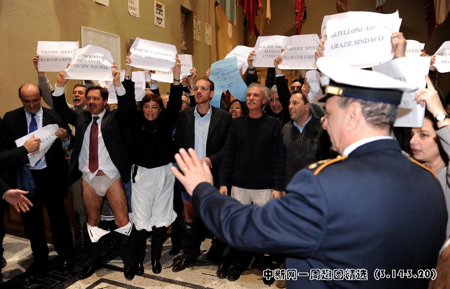 3月15日,在意大利首都羅馬,來自左翼政黨的市政官員在市政廳以脫褲子方式表達不滿。圖片來源:中國新聞網(wǎng)>>點擊觀看詳細內(nèi)容