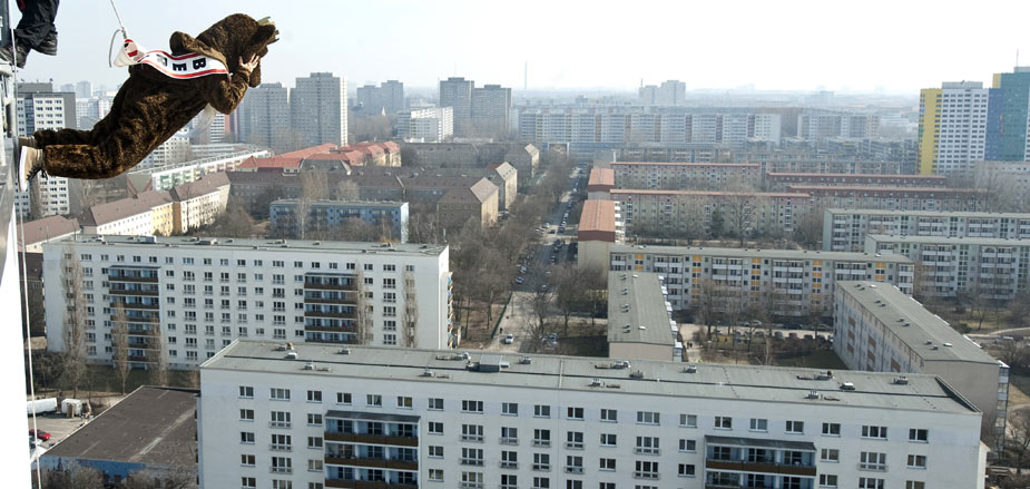 3月18日,在德國(guó)柏林舉行的“高樓漫步”活動(dòng)中,一名女子打扮成熊的模樣(柏林的象征)在天使酒店外墻上行走,參加活動(dòng)的人都有繩索保護(hù)。