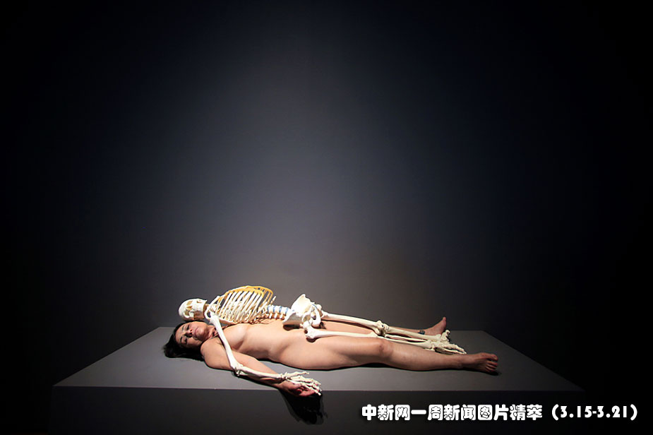 15日(周一),在紐約現(xiàn)代藝術(shù)館舉行的展覽“瑪麗娜阿布拉莫維奇:藝術(shù)家在場”上,一名女子展示作品“與骷髏一起裸體”。