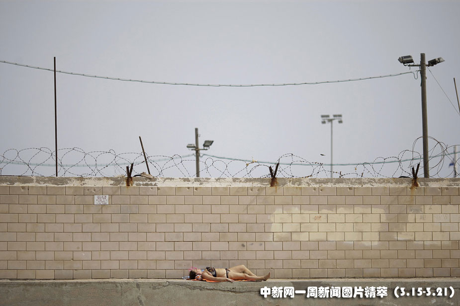 15日(周一),以色列一位女性在海法海軍軍事基地外的海灘上曬日光浴。