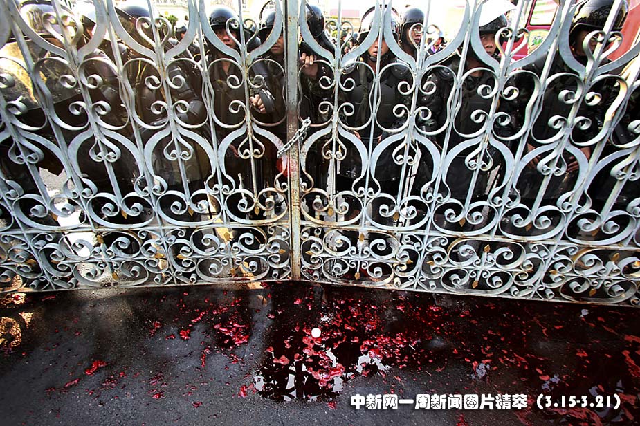 16日(周二),泰國紅衫軍將收集來的鮮血潑灑到總理府,以此向政府施壓。