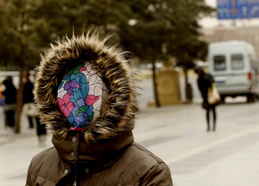 20日,北京遭遇4年來(lái)最強(qiáng)浮塵襲擊。一位行人將自己用紗巾“武裝”起來(lái)。