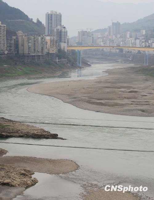 3月23日,重慶市武隆縣境內(nèi)的烏江段河床大面積裸露,河面嚴重變窄。近段時間以來,受貴州、重慶地區(qū)持續(xù)干旱、來水減少的影響,烏江航道重慶段徑流量較常年減少40%以上,水位平均下降1米左右,船舶在航行過程中多次出現(xiàn)觸礁、擱淺等事故。當?shù)胤姥纯购缔k公室透露,目前烏江重慶段已基本斷航,每天均有不少船只?看a頭等待上游的彭水電站調(diào)峰發(fā)電增大烏江水量,以便通過變得狹窄的烏江向下游航行。 中新社發(fā) 郭晉嘉 攝