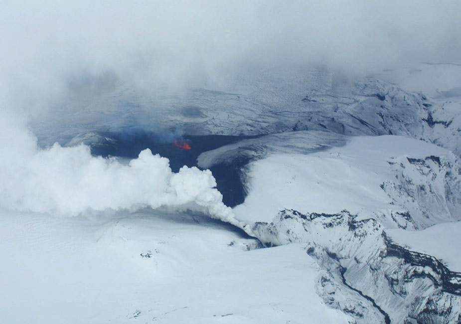 3月21日,冰島首都雷克雅未克東南方向的埃亞菲亞德拉冰蓋冰川,熔巖從火山口噴出。 這座火山于20日午夜前后就開始噴發(fā)。圖片來源:中國新聞網(wǎng)