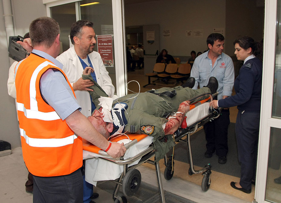 圖為英國“紅箭”特技飛行隊(duì)傷員抵達(dá)醫(yī)院接受治療。